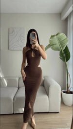 Boyundan bağlı kesimi ve bel dekolteleriyle feminen bir duruş sunan bu elbise, arka fermuar detayıyla şıklığı ve rahatlığı bir araya getiriyor.