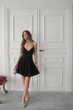İnce askılı, V yaka tasarımı ve yırtmaç detaylarıyla bu siyah mini elbise, gece davetlerinden özel buluşmalara kadar her anına şıklık katıyor. Yumuşak dokusu ve vücudu saran kesimiyle hem rahat hem iddialı bir görünüm sunar.